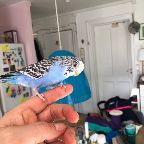 Denne lille undulatunge er nu klar til at flytte hjemmefra og søger et nyt, kærligt hjem. Den er opvokset indendørs i trygge rammer og trives bedst et sted med masser af frihed, daglig udflugts‑tid uden for buret og kærlig opmærksomhed.