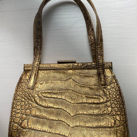 IKKE Burberry - ukendt mærke Ægte Slangeskind taske og pung til kvinde iskinnende overflade og mørk brun nuance. Tasken har to korte hanke og et struktureret design. Den matchende pung har metalramme og kliklås.