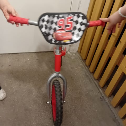 Børnecykel med 16" hjul i turkis og lilla. Cyklen har støttehjul, kædeskærm, kurv foran og saddel samt bagmonteret sæde i matchende farver. Egnet til mindre børn, der skal lære at cykle på en cykel i denne hjulstørrelse.