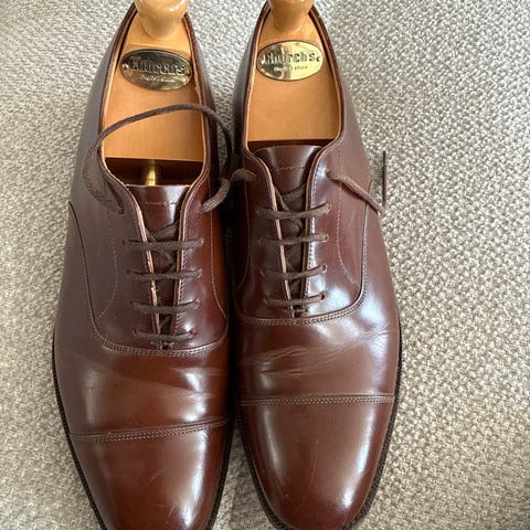 Brune cap toe brogue derby sko. UK sz 9,5. Altså EU 43,5 i følge Cheaney’s hjemmeside.