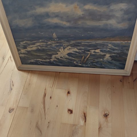 Oliemaleri med havmotiv L: 91 cm, H: 61 cm (udvendige rammemål). Kan ikke læse kunstnerens navn