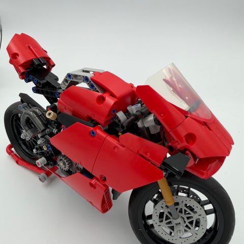 LEGO Technic motorcykel i rød. Sættet består af en detaljeret sportmotorcykel med bevægelige dele og stander. Modellen er velegnet som byggeprojekt og udstillingsmodel for LEGO Technic-interesserede. Byggesættet samles af klodser og leveres med trykt byggevejledning, som ses på billederne.