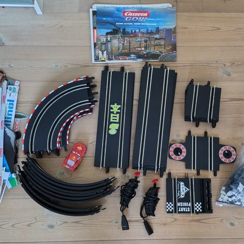 Carrera GO!!! bilbane racersæt. Sættet indeholder en elektrisk racerbane med flere forskellige baneopsætninger, herunder kurver og lige strækninger. Der medfølger to racerbiler samt tilbehør som styrehåndtag og banedele, der kan samles på forskellige måder. Egnet som legetøj til børn og til hobbybrug for dem, der ønsker en simpel racerbane med mulighed for variation i banen.