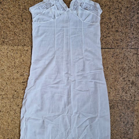 For- og bagstykke er dekoreret med blonde- eller broderidetaljer i kontrastfarve langs udskæring og forneden. Materialet er let og glat, egnet til underkjole eller let lag-på-lag kjole.
