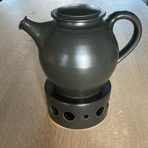Höganäs Keramik tekande på 1,5 liter i sort keramik. Kanden har indbygget metalsi til teblade og leveres med rund underkop i træ. Velegnet til brygning og servering af te. Mærket i bunden med Höganäs Keramik og Rörstrand.