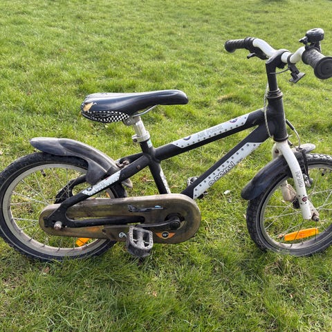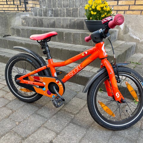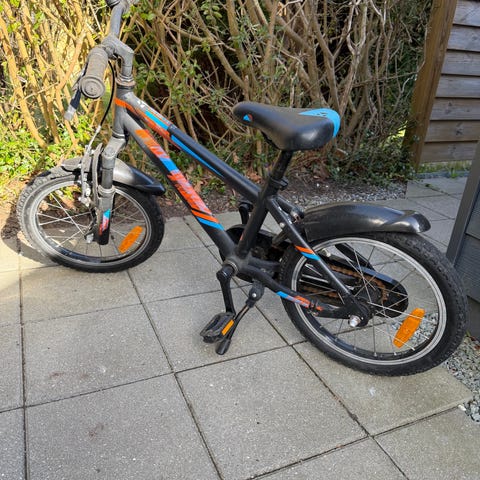 SCO børnecykel med 16" hjul i sort. Svarer til et barn på 4-6 år. Cyklen har lige styr, saddel med justerbar højde, skærme for og bag samt kædeskærm.
