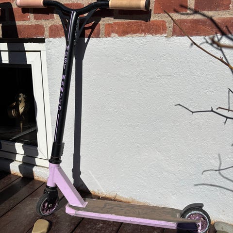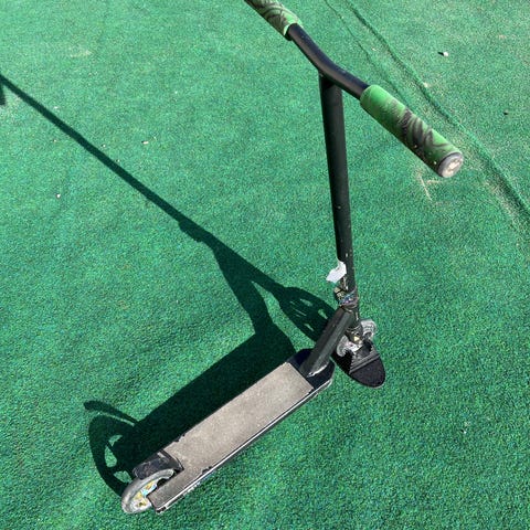 Løbehjul trick løbehjul i sort med turkisfarvede hjul. Modellen har fast styr med T-bar og håndtag med greb. Dækket er lavt og bredt med skridsikkert griptape og turkis stribe. Hjulene er små og hårde, velegnet til tricks og kørsel på glatte underlag som asfalt eller ramper. Bagtil er der fodbremse over baghjulet. Egnet til større børn eller unge, der ønsker et robust trickløbehjul.