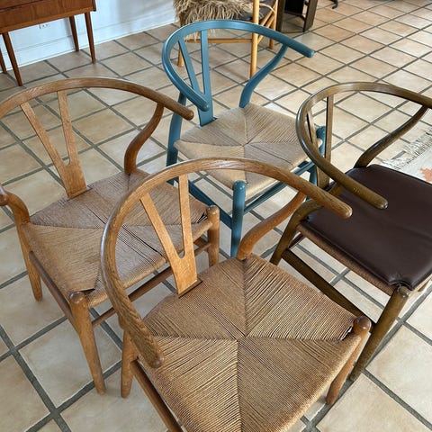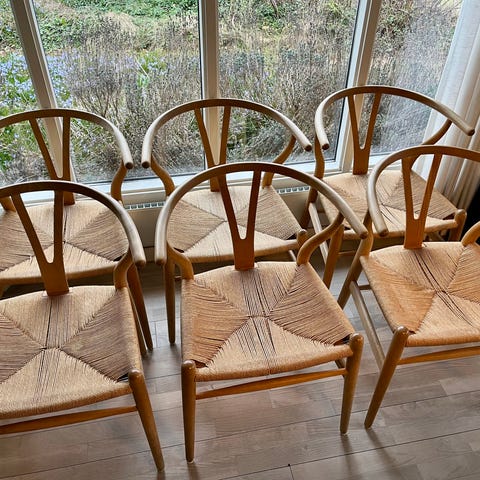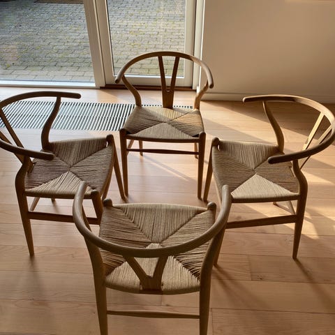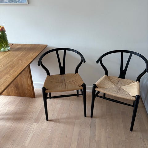 6 stk Y-stole i sort egetræ og med sorte sæder. Det er faste I stellet og fletten og har de normale brugsspor (se billeder)