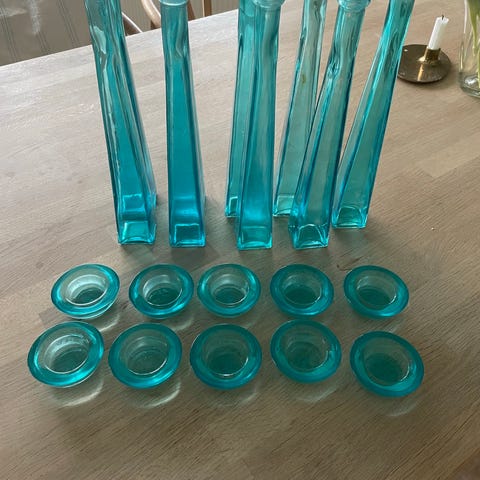 10-12 buketter med smukke blå kunststof-blomster. Købt til bordpynt til en konfirmation. Står helt som nye.