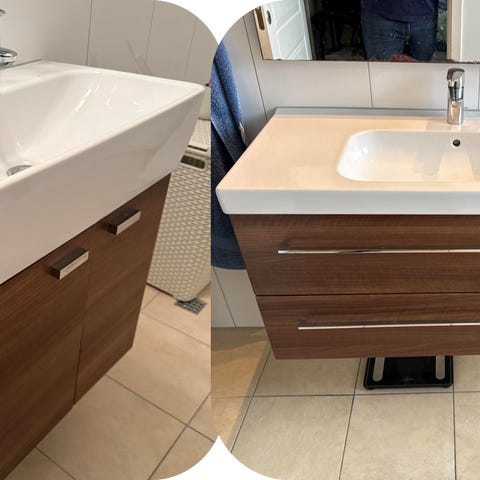 2 Dansani badeværelsesmøbler med integreret hvid porcelænshåndvask i buet design. Skabselementer i lys ask finer med metalgreb.