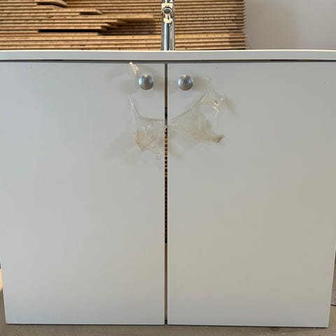 Badeværelse 2: Over vasken er der spejl og overskabe med hylder til opbevaring. Der er 3 bitte små afslag på vasken samt finer er gået lidt fra på siden af 1 låge.