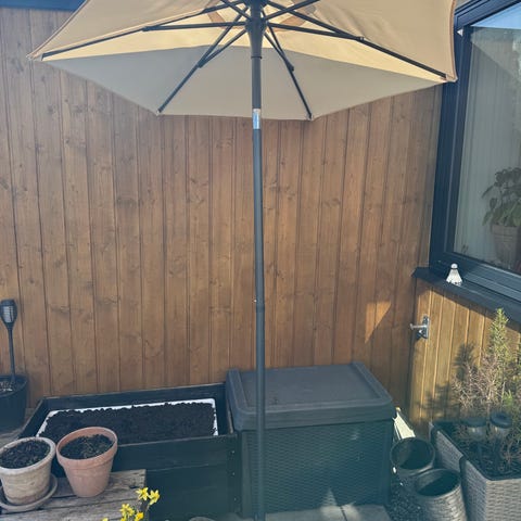 Parasol sort med fod til terrasse