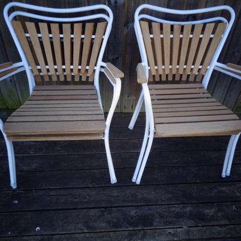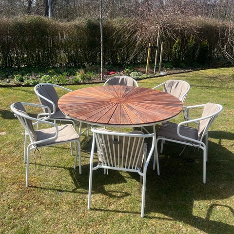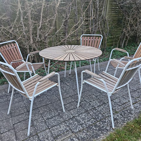 Fremstår patineret. Er ikke blevet gjort klar til sæsonen endnu. Trænger til ny hvid metalmaling og teaktræsolie.