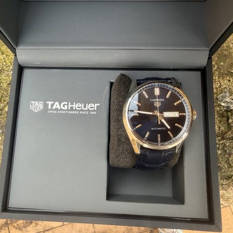 TAG Heuer med sølvfarvet skive.