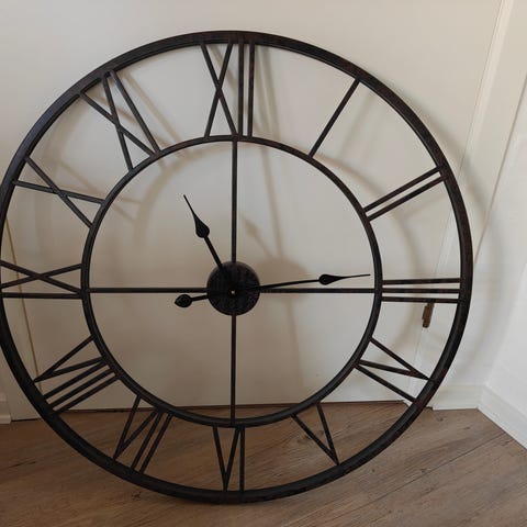 Flot vægur med sort marmoreret baggrund, messing visere og tale, og eg ramme Ø40