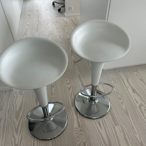 Bombo Stool blev designet i 1996 af Stefano Giovannoni for Magis. Barstolen har en base og et fodstykke i forkromet stål og et sæde i formstøbt ABS, der kan justeres til forskellige højder.