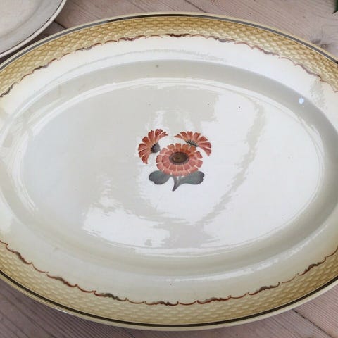 Det er kendetegnet ved sin cremegule fajance med en flettet bort langs kanten og de ikoniske luftmalede orange morgenfruer med grønne blade.