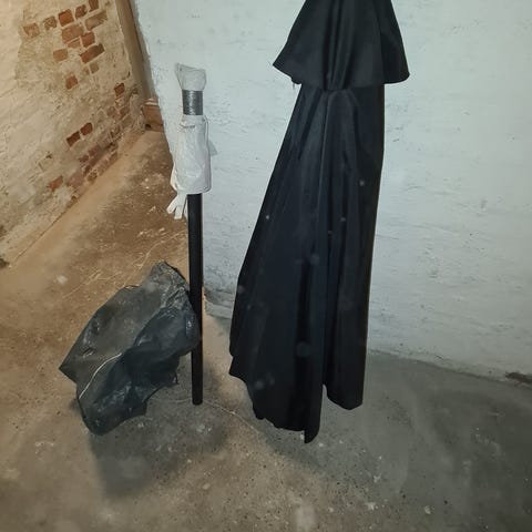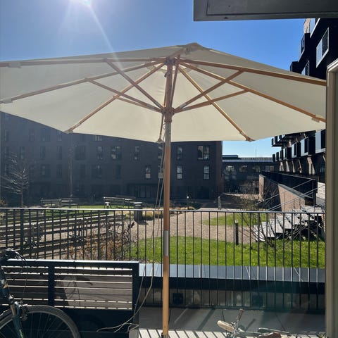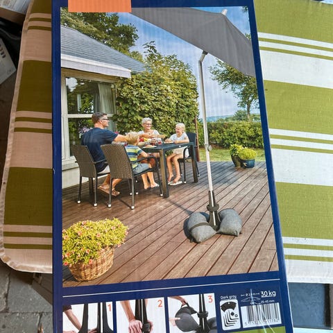 Markedsparasol + parasolfod. Samlet pris 500 kr. Befinder sig ved Maribo.