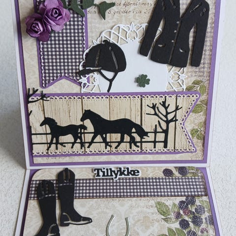 Hjemmelavet fødselsdagskort med hundemotiv i karton. Kortene er dekoreret med udstansede figurer af hund, kødben, hjerter, balloner, gave, madskål og dansk flag samt teksten "Tillykke" rundt i en cirkel. Forskellige farvekombinationer, blandt andet rød, blå, pink og grøn baggrund med kontrastfarver på motiverne. Egnet som fødselsdagskort til hundeelskere eller til børnefødselsdag. Kortet kan stå oprejst og har dekoration både på forside og inderside med plads til egen hilsen.
