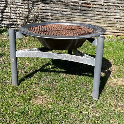 Rundt ildfad i metal, velegnet som bålsted til terrasse eller have. Fadet står på tre ben, som løfter det fra underlaget. Overfladen bærer præg af brug med rester af aske og sod. Egnet til optænding af bål eller brug med grillrist, hvis man har en passende størrelse. Kan placeres på fliser eller anden brandsikker overflade udendørs.
