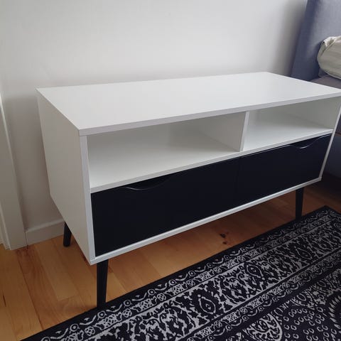 Jeg sælger dette stilrene, hvide møbel med et minimalistisk design, der passer perfekt ind i de fleste hjem. Det fungerer rigtig godt som TV-møbel eller lav opbevaringsløsning i stuen.