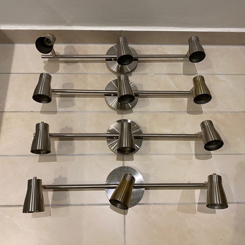 Ceiling spot track with several adjustable spots in metal. The system is mounted on the ceiling and allows directional lighting. Suitable for a living room, office, or hallway where flexible and focused lighting is needed.