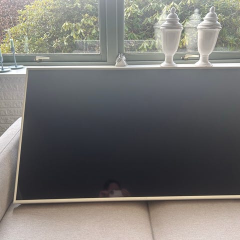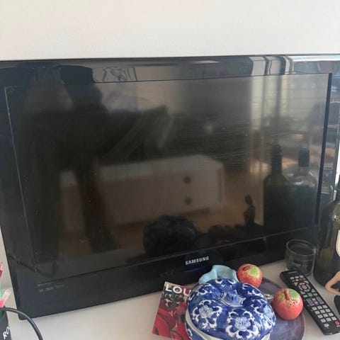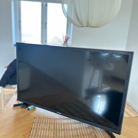 Samsung fladskærms-tv i sort. Tv’et har en slank ramme og står på et V-formet bordstativ. Der medfølger Samsung-fjernbetjening som vist på billederne. Velegnet til placering på tv-møbel, eller TV ophæng. 124x72 cm.