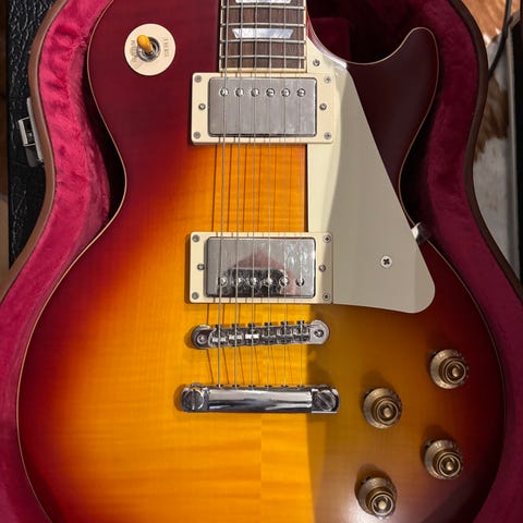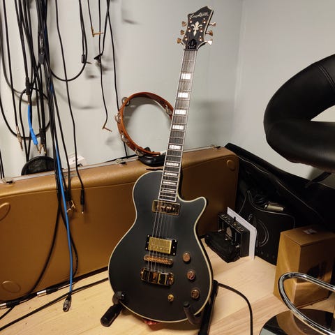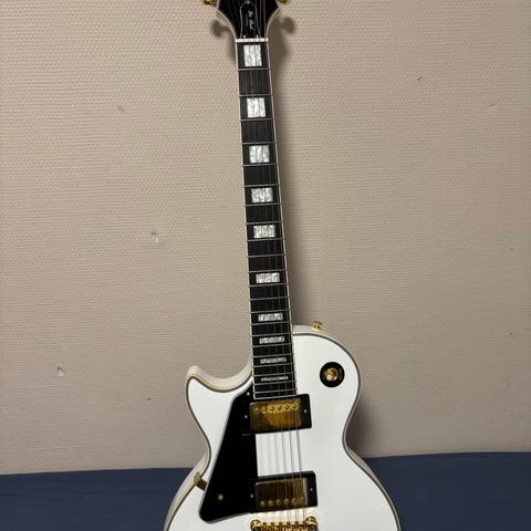 Modellen er en Epiphone Matt Heafy Les Paul i den meget sjældne “Snøfall” version. Den blev kun produceret i halvandet år i 2017-2018 og er eftertragtet blandt samlere.