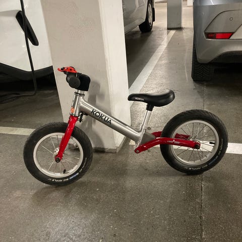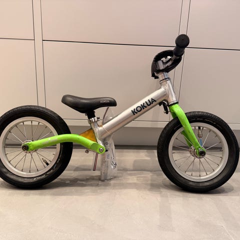 Kokua løbecykel med 12" hjul. Cyklen har aluminiumsstel i sølv med orange forgaffel. Udstyret med luftfyldte dæk og justerbart sæde. Velegnet som balancecykel til mindre børn, der skal øve balance og styreteknik før overgang til almindelig cykel.