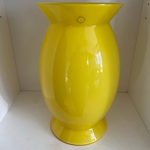 Glasvase i flerfarvet glas med blå, grønne og gule nuancer. Vasen har en kraftig, massiv glasform med firkantet åbning foroven og organiske, strukturerede sider. Velegnet som dekorativ genstand eller til mindre blomsterarrangementer. Kan placeres på bord, hylde eller vindueskarm som del af boligindretningen. Har brugsspor, ingen skår, men så flot i farven