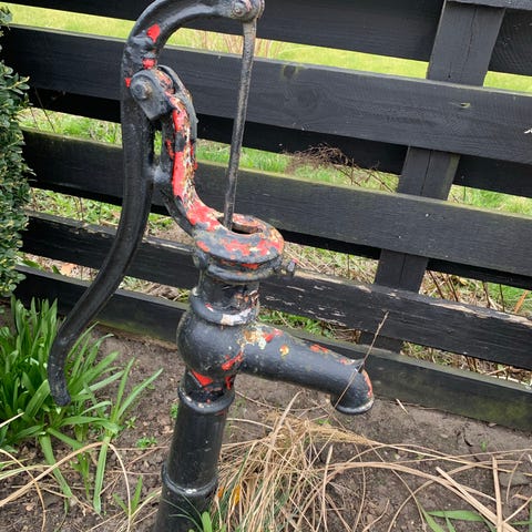 Gammel håndpumpe til brønd i metal i hvid farve. Pumpen består af et lodret rør med pumpehus og udløbstud samt håndtag. Egnet som dekorativt element i have eller ved brønd. Ingen pumpefunktion.