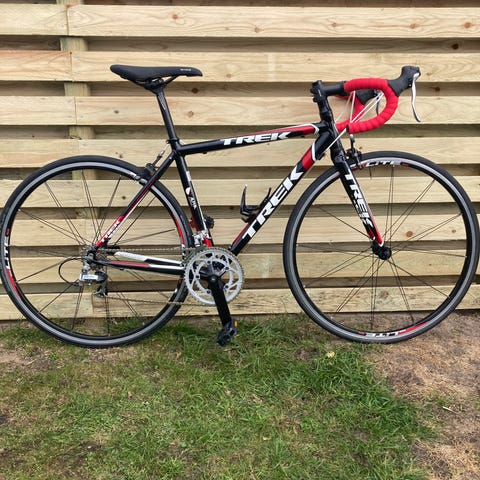 Trek racercykel i unisex-udgave med stelstørrelse M. Cyklen har racerstyr med integrerede gearskiftere, 18-speed gearsystem fra Shimano 105 og smalle racerdæk til kørsel på asfalt. Alu-stel, men Carbon gaffel og saddelpind.