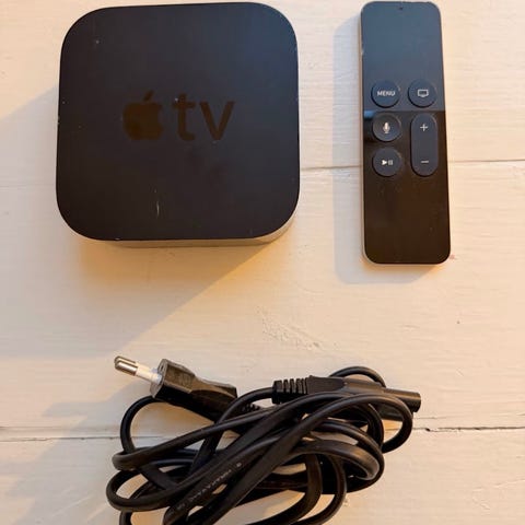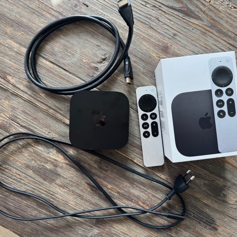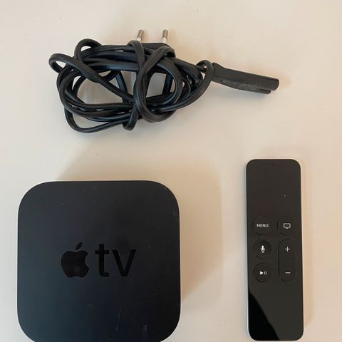 Apple TV med Siri Remote medieafspiller i sort. Enheden leveres med fjernbetjening i aluminium med indbygget touch-felt og dedikeret knap til mikrofon. Medieafspilleren tilsluttes tv’et via HDMI (kabel ikke synligt på billederne). Enheden kan bruges til streaming af film, serier, musik og apps via internetforbindelse. Understøtter trådløs netværksforbindelse og tilslutning til Apple-id for adgang til relevante tjenester og funktioner.