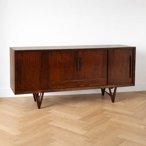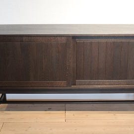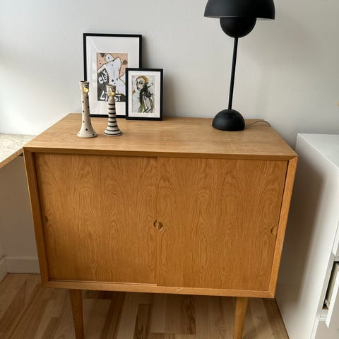 Bag de 2 store profilerede låger er der hylde i den ene side og delvis hylde/betrukne tappede skuffer i den anden.