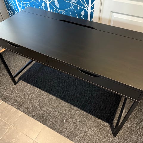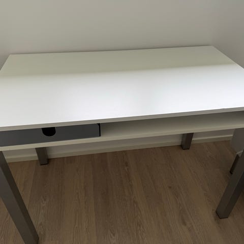 Ikea skrivebord, hvid laminat, brugsspor på bordplade