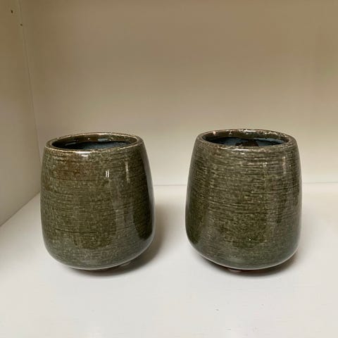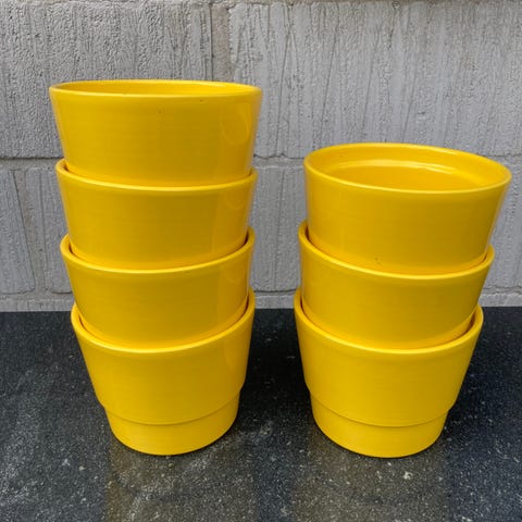 To gule/hvide urtepotteskjulere incl. planter. 12 cm høje og 10 cm i diameter. Sælges samlet for 50 kr.