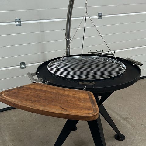 Den aftagelige rist gør det nemt at flytte maden væk fra gløder eller at tilføje brænde. Skærebrættet og redskabsholderen holder ingredienser og redskaber tæt ved arbejdsfladen.