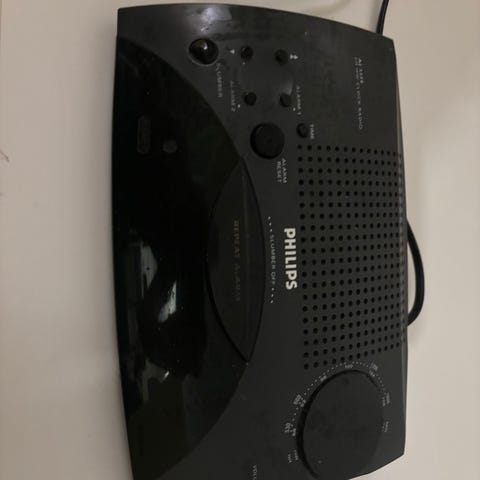 Philips clockradio som har digitalt display på fronten og betjeningsknapper på toppen til blandt andet radiokanalvalg, alarmindstilling, snooze og lysstyrke. På bagsiden findes strømtilslutning og USB-port. Leveres med strømforsyning som vist på billederne.