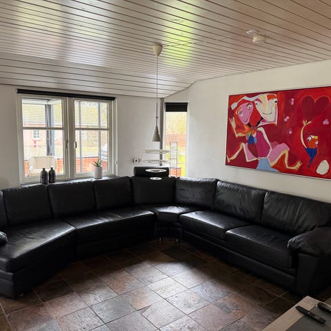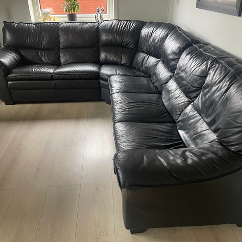 Hjørnesofa i sort læder. Sofaen er udformet som en større hjørnesofa med lav ryg og bløde, polstrede sæder. Overfladen fremstår glat og ensfarvet i sort. Sofaen er velegnet til stue eller opholdsrum, hvor der er behov for flere siddepladser samlet i et hjørne.