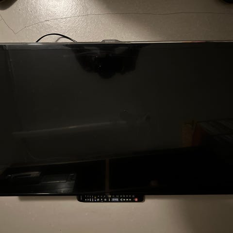 Tv virker perfekt og er brugt i vores sommerhus. Samsung 32 ". Der er mulighed for at hænge det op, men der er ingen rigtig fod med til tv'et. Der mangler en strømkabel, men det er et standardkabel.