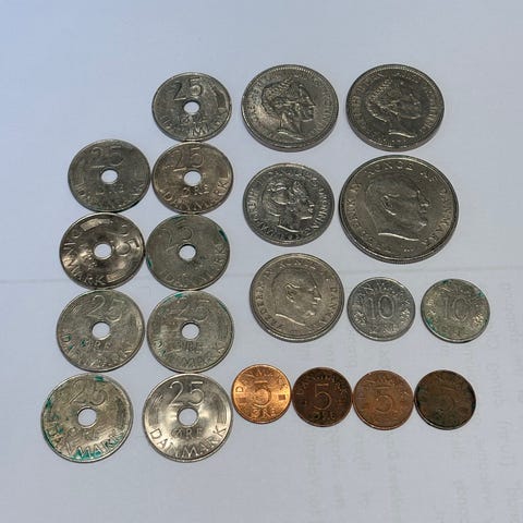 Danmark møntsamling med blandede danske mønter i plastlommer. Mønterne fremstår i forskellige størrelser, årgange og metaller, herunder både gennemhullede og hele mønter. Samlingen er opbevaret i gennemsigtige plastlommer med individuelle rum til hver mønt, hvilket giver et overblik over indholdet og gør det egnet til videre samling eller sortering efter årstal og pålydende værdi.