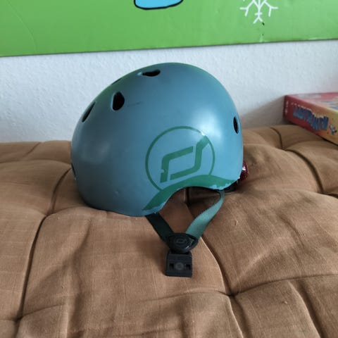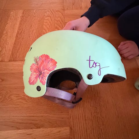Molo cykelhjelm i hård plast med indvendig støddæmpende skum. Hjelmen er gul og flerfarvet med striber og stjernemotiv. Justerbare remme under hagen med klikspænde. Flere ventilationshuller i toppen og bagtil for luftcirkulation. Velegnet til cykling eller løbehjul for børn, afhængigt af størrelse og pasform.