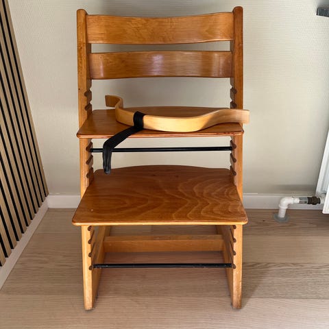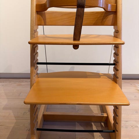 Stokke Tripp Trapp højstol i naturfarvet træ. Den er udstyret med bøjle og rem foran. Prisen er fast. Afhentes i Gilleleje