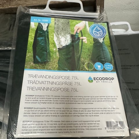 Treegator vandingspose i grøn plast/lamineret vævet materiale til langsom vanding af træer og buske. Posen placeres omkring stammen og fyldes med vand, som langsomt siver ud til rødderne.