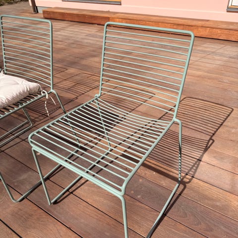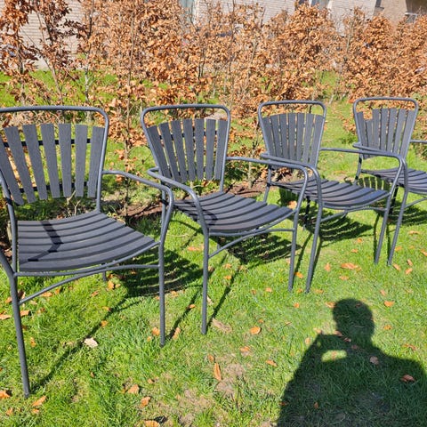 Sæt med fire havestole med armlæn i grå metal. Stolene har lameller i sæde og ryg samt buede armlæn. Stellet er udført i metalrør, og stolene kan stables for nem opbevaring. Velegnet til udendørs brug på terrasse eller i have.
