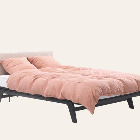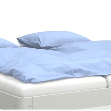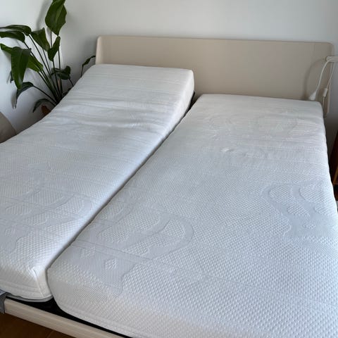Auping seng med madras. Sengen har polstret, mørkt sengegavl og en lys madras. Altid brugt med rullemadras eller top madras