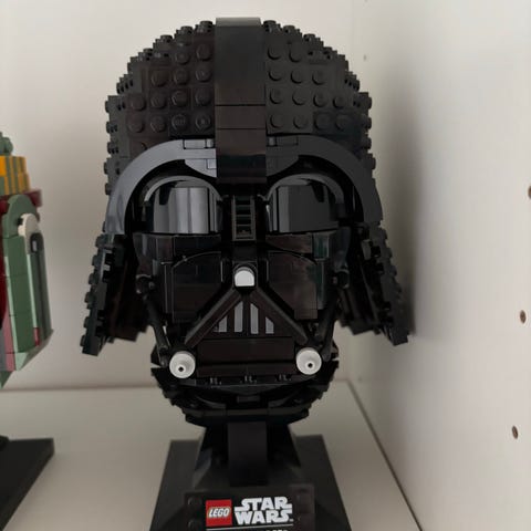 LEGO Star Wars hjelm. Samlesæt i klodsform, der forestiller en hjelm fra Star Wars-universet, monteret på en lille sort stander med navneplade. Egnet som udstillingsmodel og samlerobjekt for LEGO Star Wars-fans.