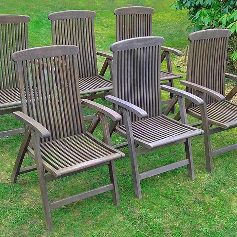 Fire havestole i teak, egnet til udendørs brug på terrasse eller i have eller udestue. Ryggen kan justeres og lægges ned.