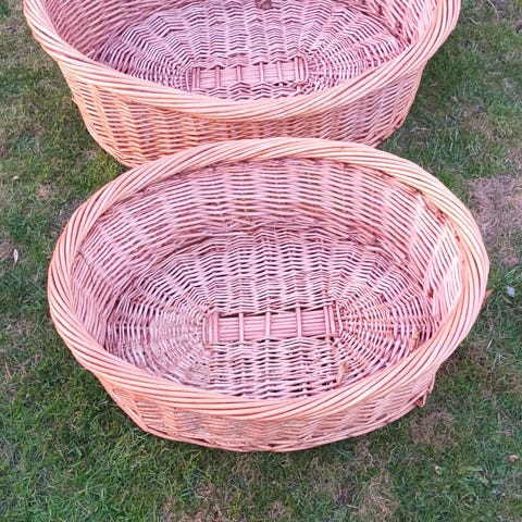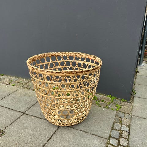Flettet oval kurv i sort. Kurven er lavet i et mørkt, lakeret fletmateriale og har bærehåndtag i siderne. Velegnet til opbevaring eller dekoration i hjemmet.