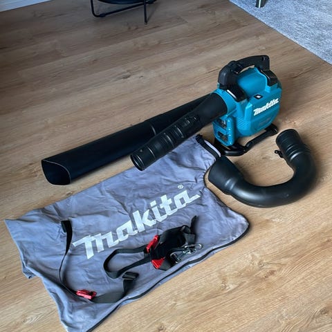 Makita løvsuger og løvblæser med opsamlingspose og bærestrop. Enheden har blæserrør og sugeslange, der leder det opsamlede materiale ned i posen. Egnet til oprydning af blade og mindre haveaffald på terrasser, indkørsler og lignende udendørsarealer. Batteri og lader fremgår ikke af billederne og kan derfor være nødvendigt at tilkøbe separat afhængigt af model.